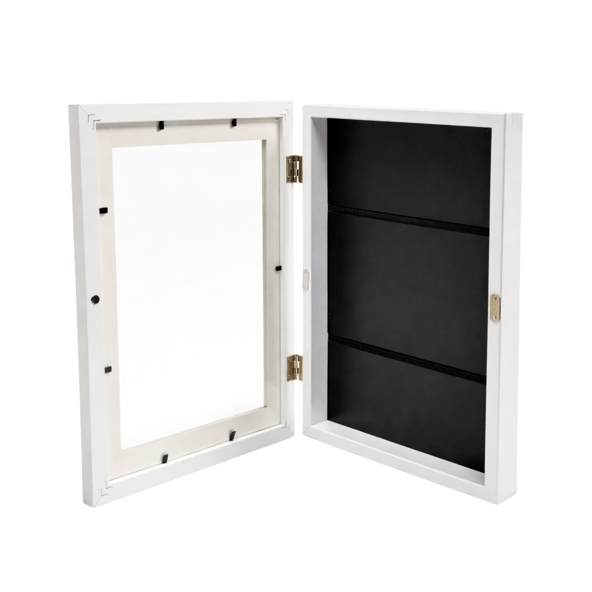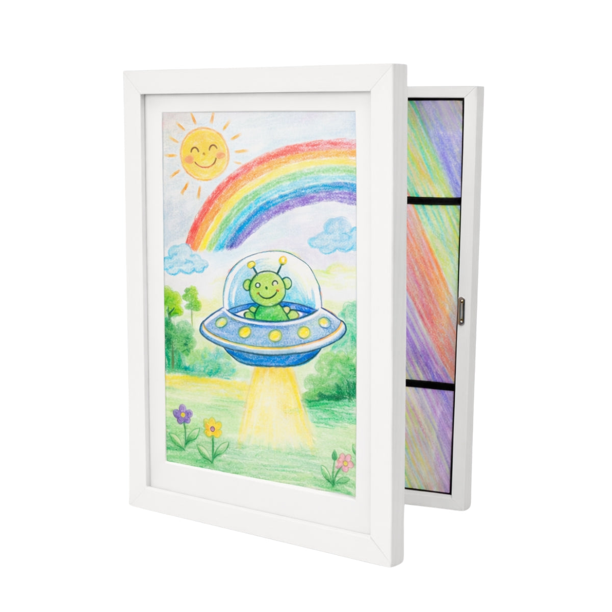 Barnetegninger + orden = sant. Endelig en bilderamme som både er praktisk og personlig. Denne smarte tegningsrammen kan åpnes som et lite skap, så du enkelt kan bytte ut tegningene etter hvert som nye mesterverk dukker opp. Det er plass til flere A4 tegninger samtidig og den lukkes med en magnetlås. Kan henges både stående og liggende