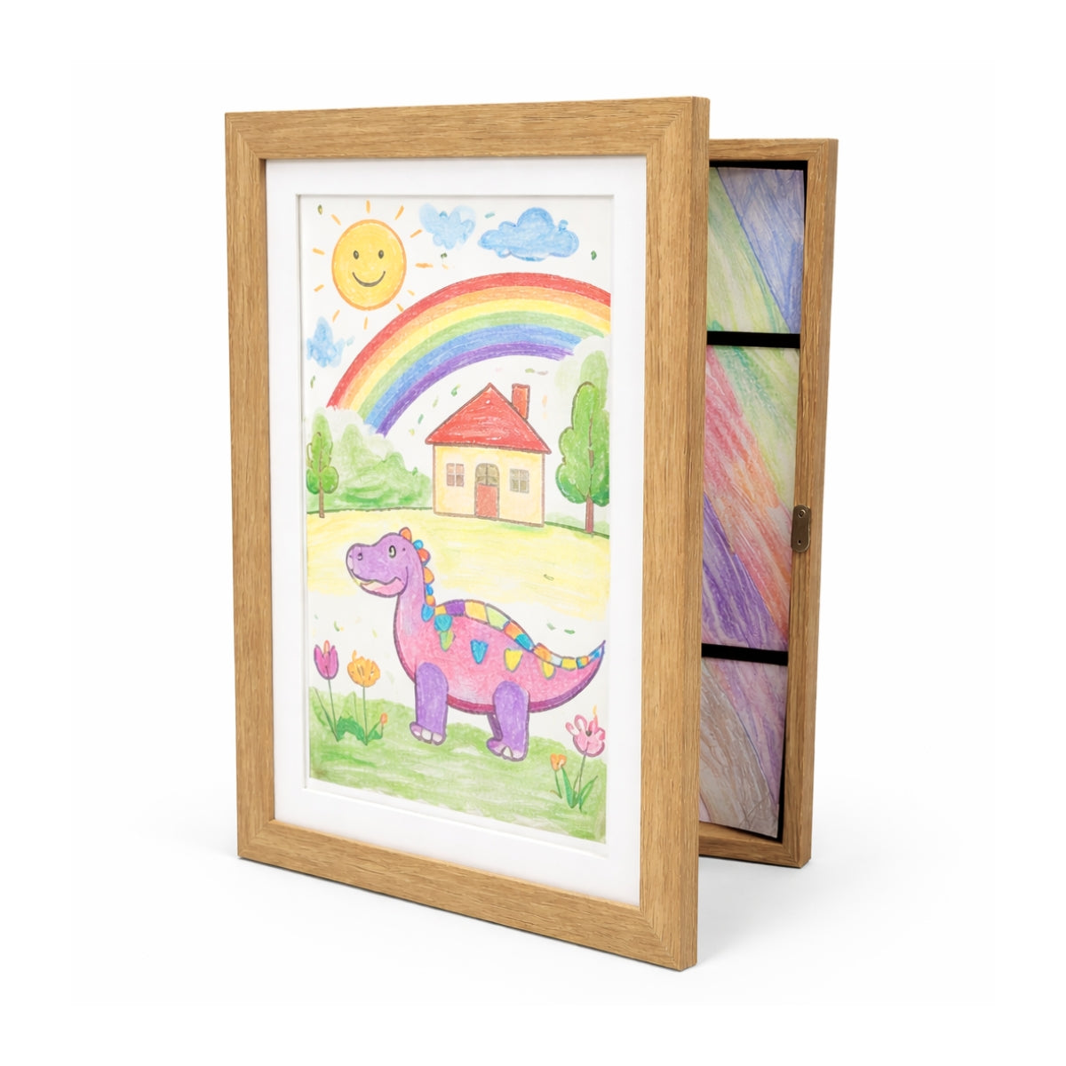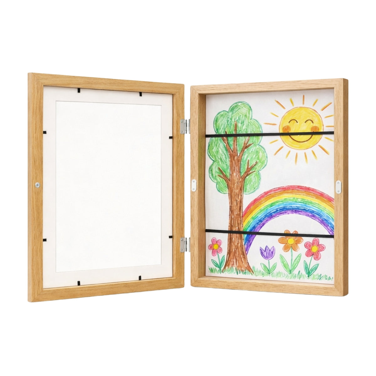 Bevar og vis frem barnas kunstverk på en praktisk og fin måte med tegningsramme i naturfarget tre. Den åpnes enkelt fra fronten, så du kan bytte barnetegning uten å ta rammen ned fra veggen. Kan henges både stående og liggende.