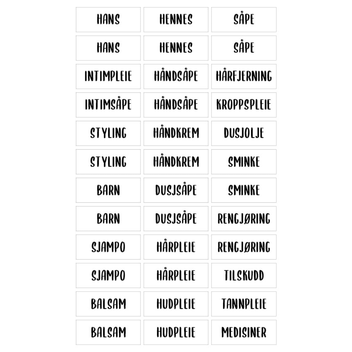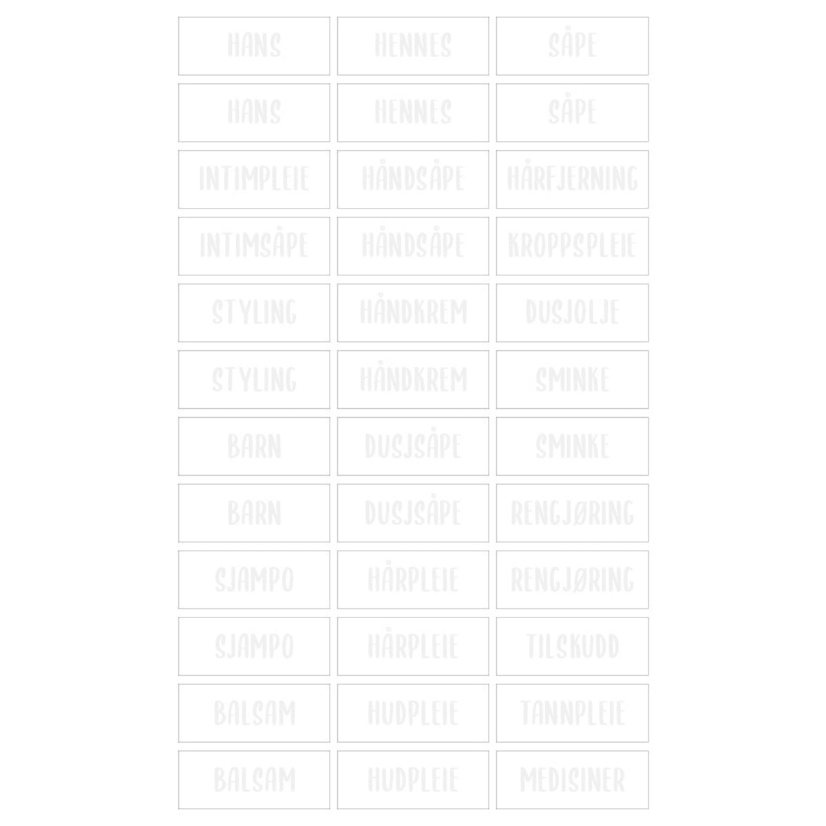 Disse stilrene etikettene gir deg full kontroll på hva som er hvor – uten rot eller mismatch. Bruk dem på flasker, beholdere, kurver og skuffer for et gjennomført og ryddig baderom.